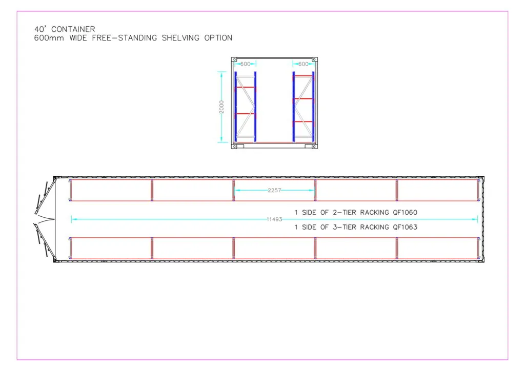 It is possible to use racking on both sides of the 40ft container (choice of two or three tier). However in the 40ft there is not enough space for racking on the end of the container when using the racking down the 40ft sides . If you only want racking at the end of the container you can use two tier racking for container rear (QF 1065) or three tier racking for container rear (QF1066). See the racking diagram download for more details.