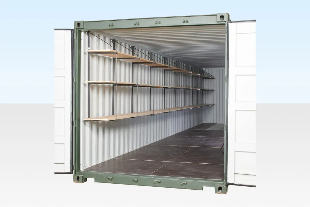 The fast-fit shelving is designed as a quick and easy to assemble container racking solution, designed to hook on to the internal D rings found on the ceiling of the container.