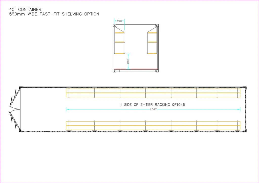 This set of shelving brackets allows both sides of a 40ft container to be fitted with 3 tiers of shelving as per the CAD drawing shown in the product download section.